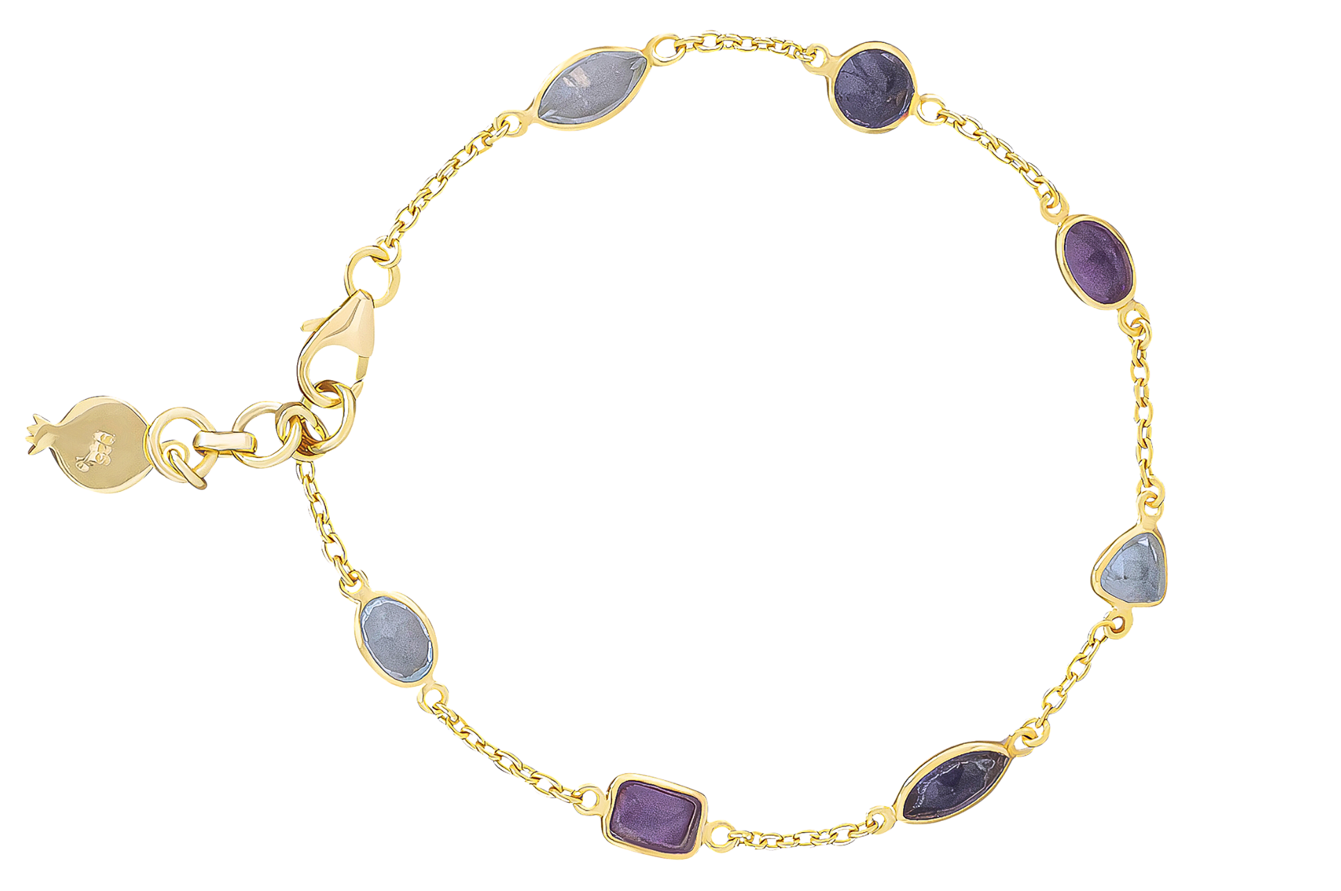 Materials: the bracelet is made of gold plated sterling silver and set with amethyst, iolite and blue topaz.