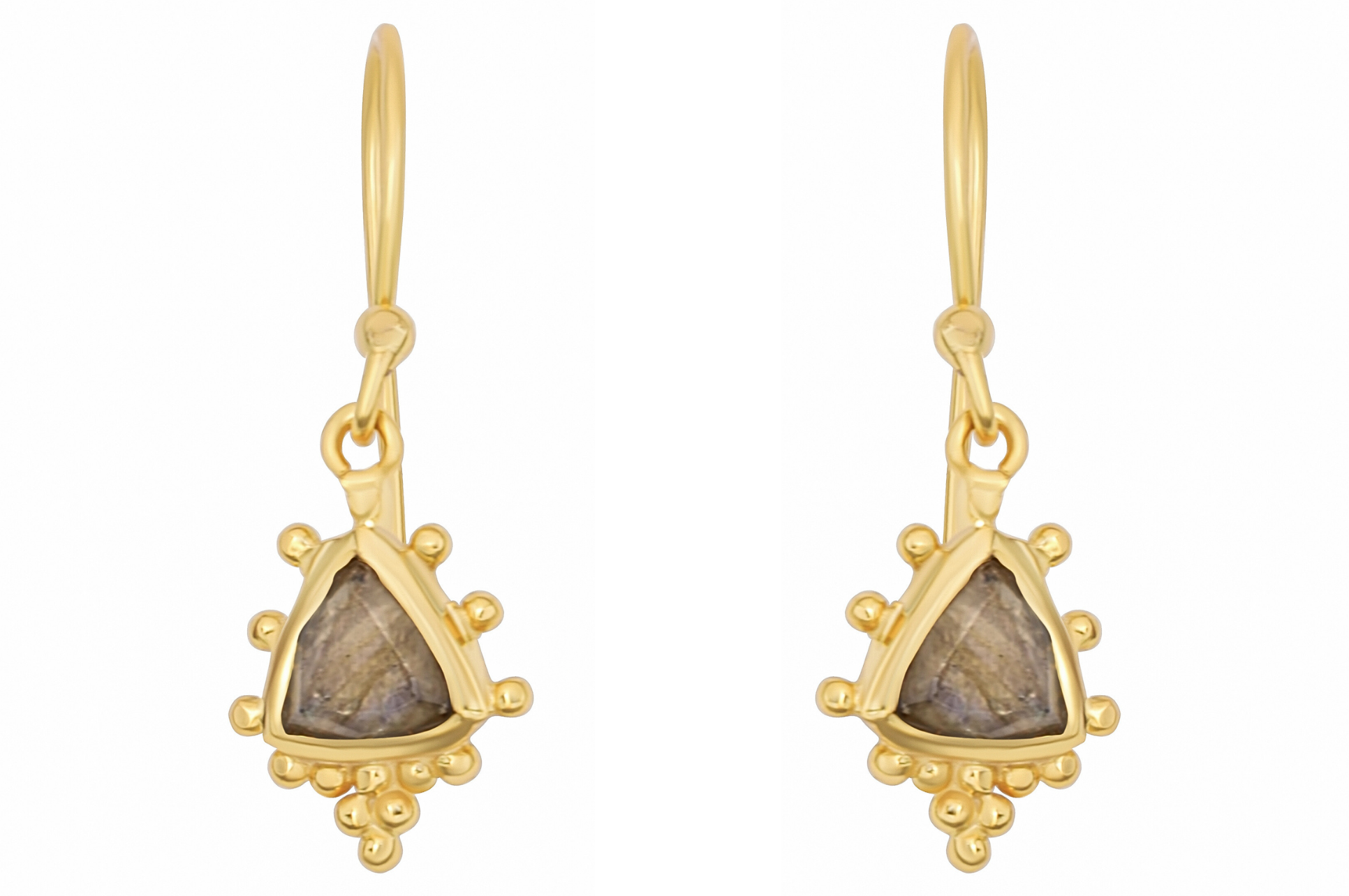 The trillion shaped labradorite gemstones in these earrings are set in an ornate gold setting dotted with golden spheres.