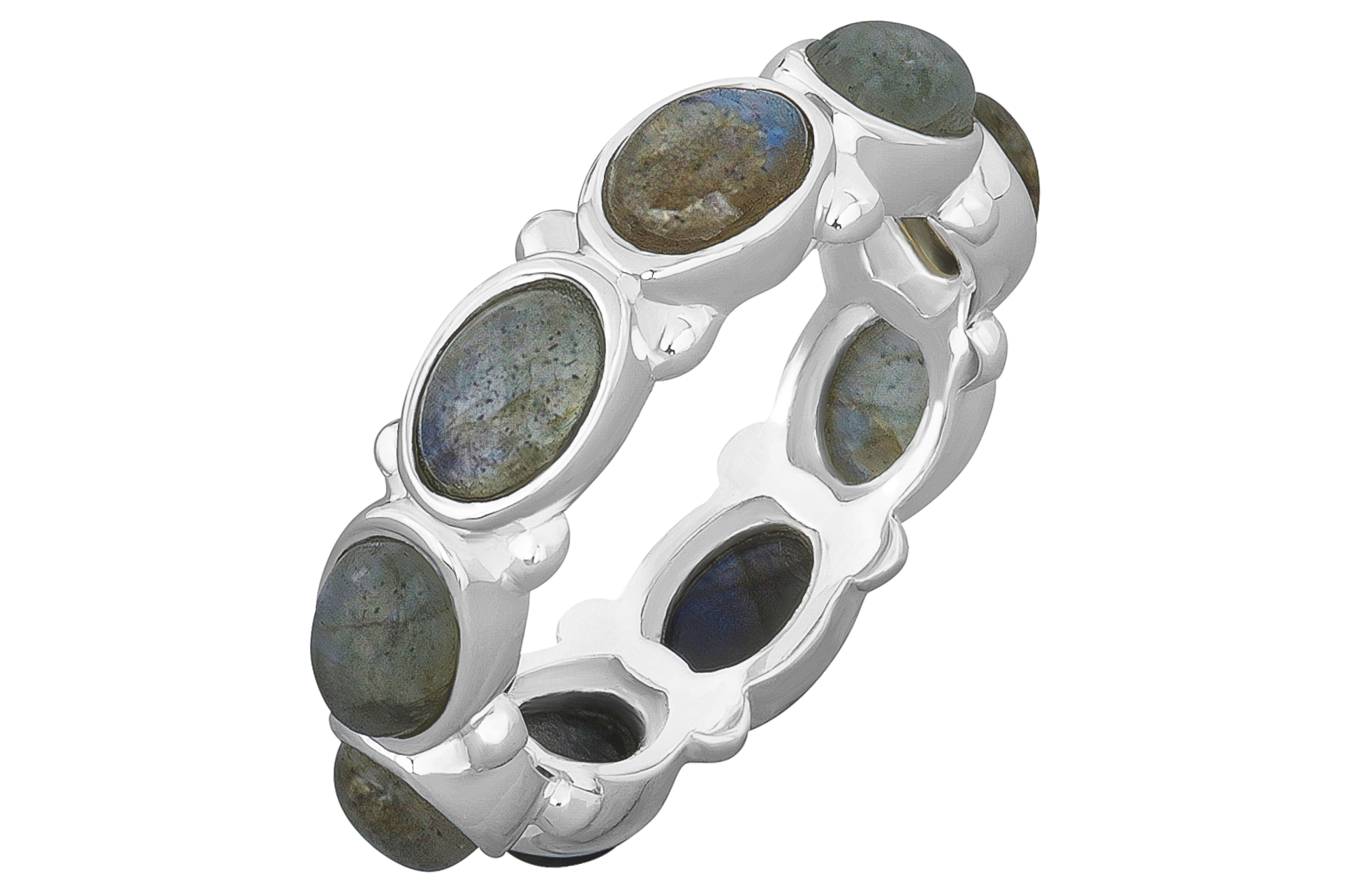 A beautiful silver Labradorite eternity ring set with oval, cabochon-cut gemstones.  View all of our Gemstone Eternity Rings.
