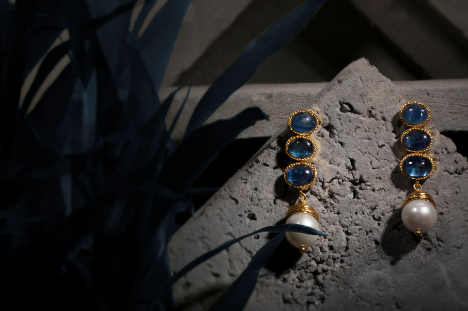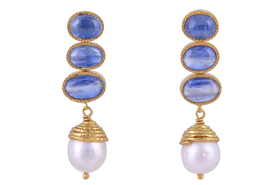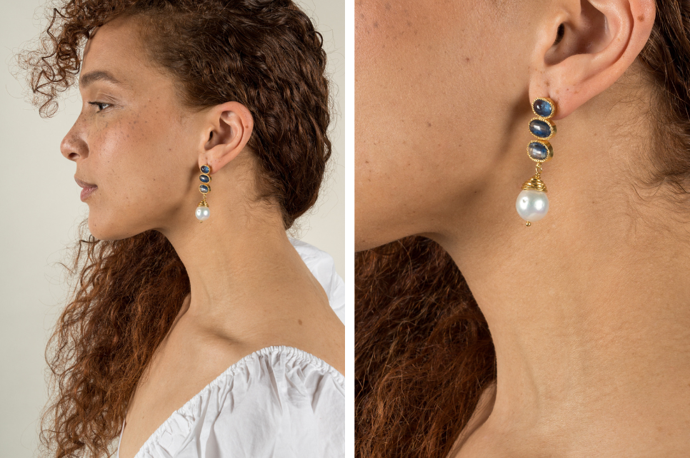 Our popular Poppy Gemstone Earrings are available in several gemstone options and with different configurations of gemstones. In this iteration the earrings are set with three royal blue kyanite gemstones and have a beautiful baroque pearl hanging from the bottom.